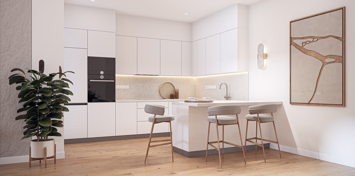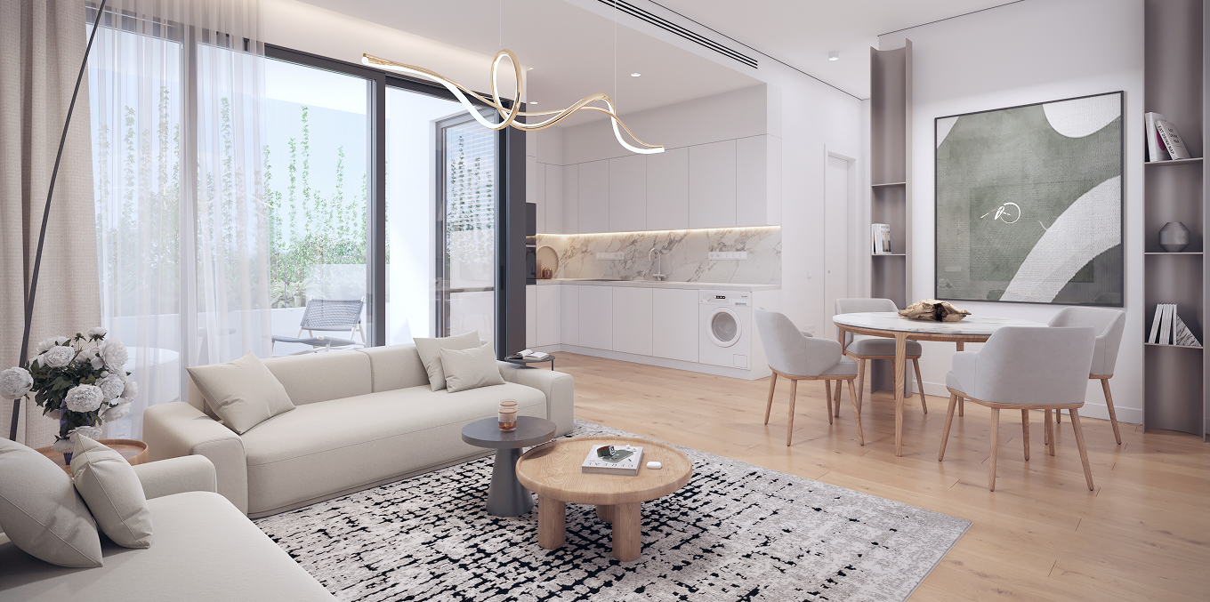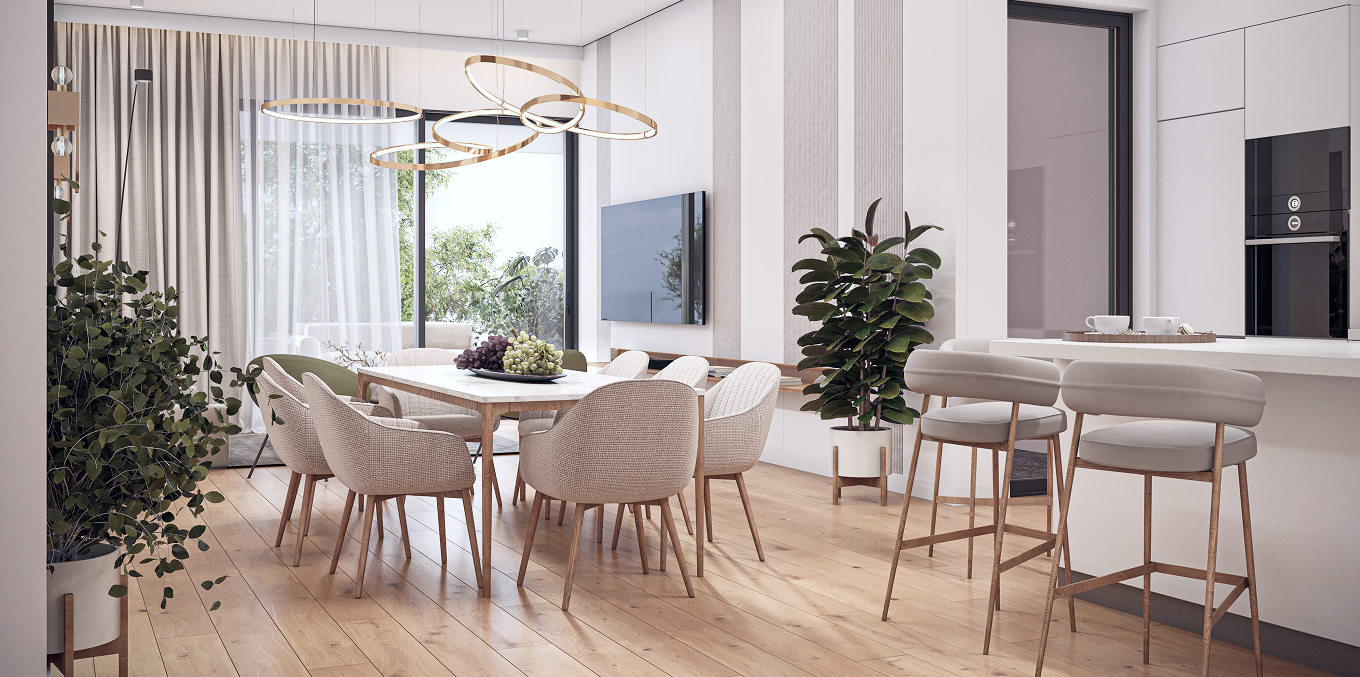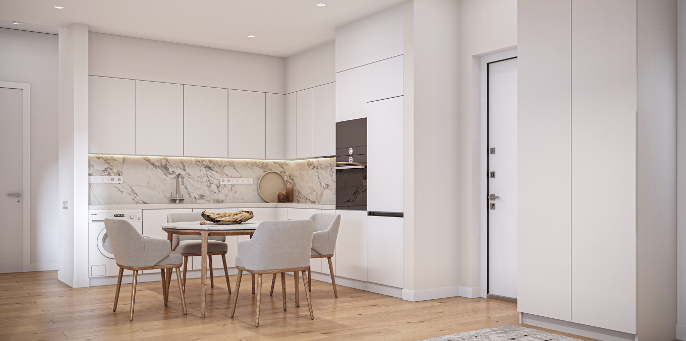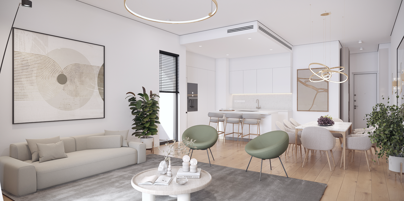 At the core of the project is thoughtfulengineering and next-generation comfort. Insulated facades and thermal windows ensure a stable indoor climate, while preparation for concealed air-conditioning and energy-efficient underfloor heating allows for a fully customized climate solution. Floors made of modern materials, along with eco-friendly kitchens and wardrobes, create a harmonious interior aesthetic.